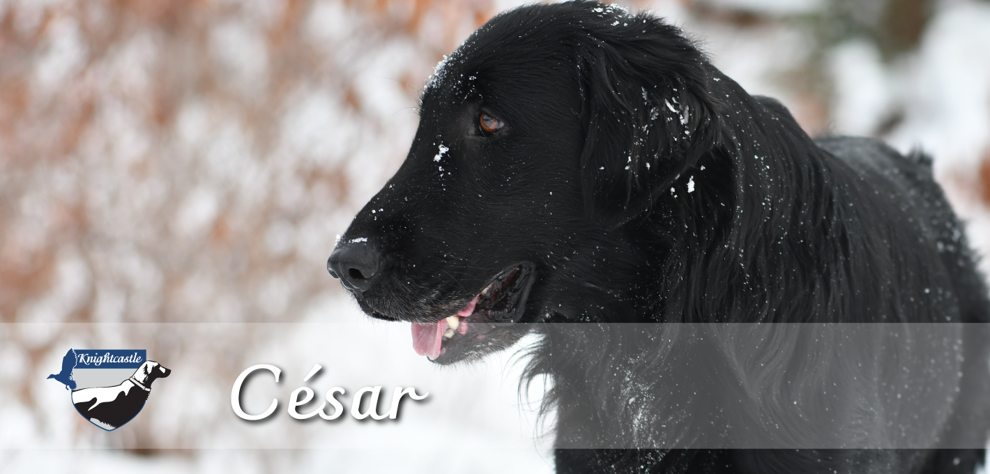 De ces quatre chiots coincés, le petit mâle au collier bleu est finalement le seul à avoir survécu et c’est ainsi qu’il a obtenu son nom : César, pour césarienne ! En réalité, il est né le lundi 17 décembre 2019 à la clinique vétérinaire et non à la maison, le seul dans toute l’histoire de Knightcastle.